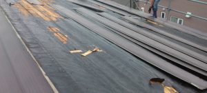 ↑ 屋根板金を剥がします^^ その当時は主流の防水紙(黒い紙のようなモノ)が見えてきました