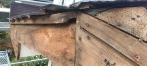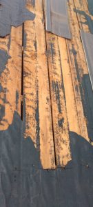 ↑ 防水紙を剥がして下地材を確認します^^; なかなか剥がれない(長い時間をかけて太陽の熱によって溶けた状態)部分もありました