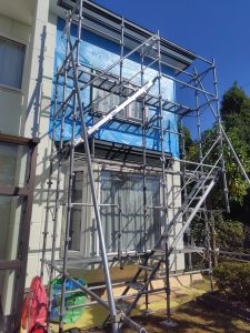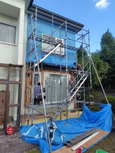 最近の天気は解りにくいので外壁撤去と同時に青いシートで養生も行います^^